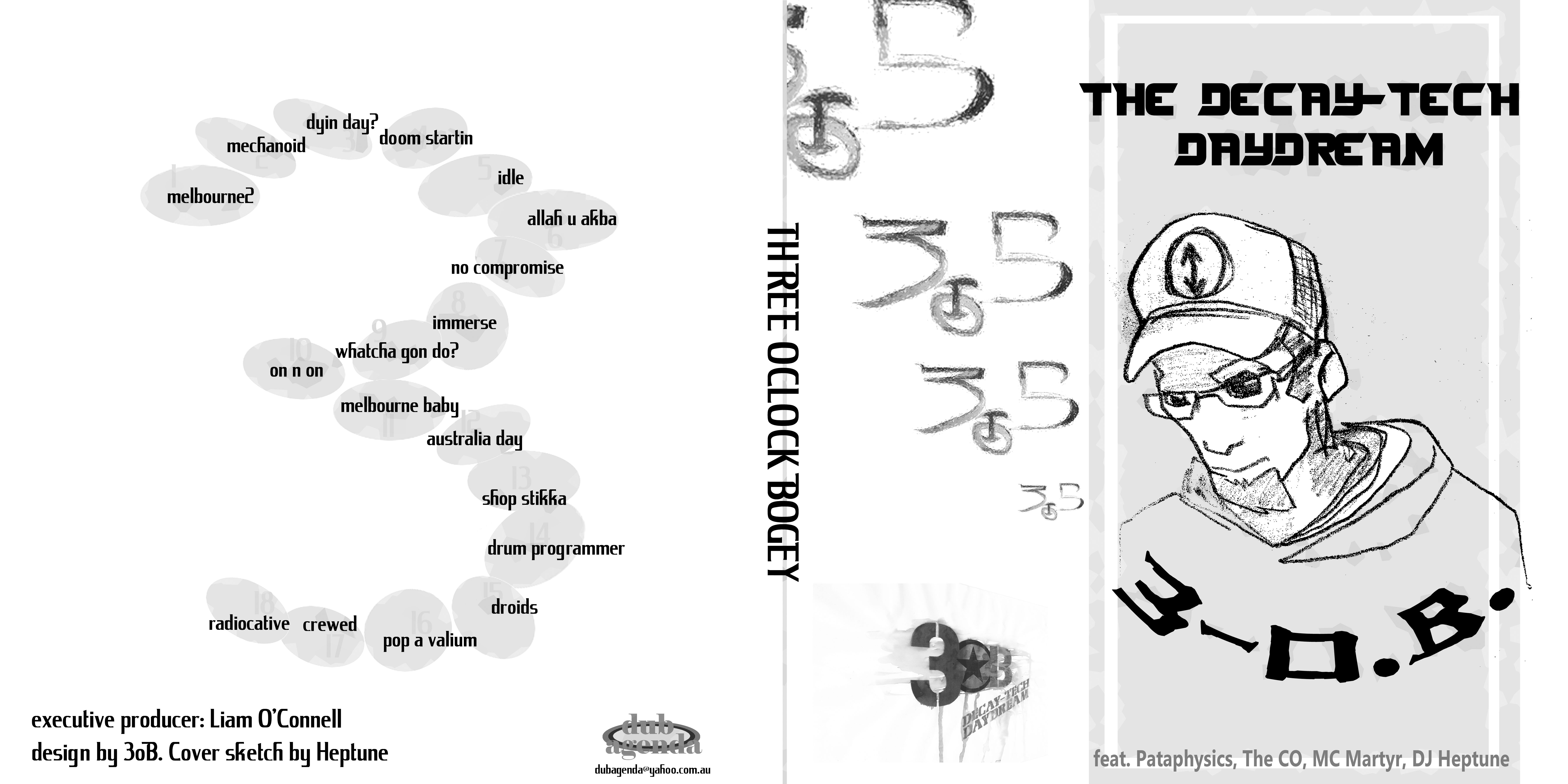 3ocloc Bogey by Dubagenda/3oB. Written and recorded in Abbottsford, Victoria 2007-09. The debut album from Melbourne emcee 3oB (3ocloc Bogey) features collaborations with the crème de la crème of mid-2000s independent oz hip hop artists; Krisdafari, COX1 (Rex Mundi), The Master and Pataphysics. Many solo 3 verse concept tracks relating to life as a self-made musician also appear on the album. This long-player was only released when 3oB had formally stepped down from the mic with Agency Dub Collective. Feeling there was not sufficient room in his injured brain for the lyrics and identities of 2 front men, 3oB put himself and hiphop first with this album, extracting all the firepower from his beat-making arsenal and lyrical ammunition. The result is unambiguously a slept-on classic, which many heads have not discovered. Only available on Bandcamp. Mastered by Lotek at Counter Clockwise studios, Collingwood, Victoria.