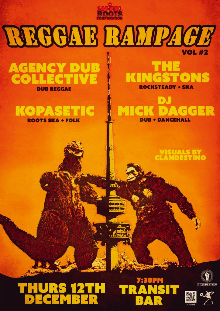 Stalwart Canberra Ska/Rocksteady massive The Kingstons then take to the stage led by the powerhouse front man (and poster artist) Brett Olzen. Heading up the evening is Agency Dub Collective, whose signature spacey jams and relentless rubadub feels have rumbled Canberra’s limestone caves for 2 decades. FACT: This is their twentieth year in dub. FACT: This is Dubby Xmas.